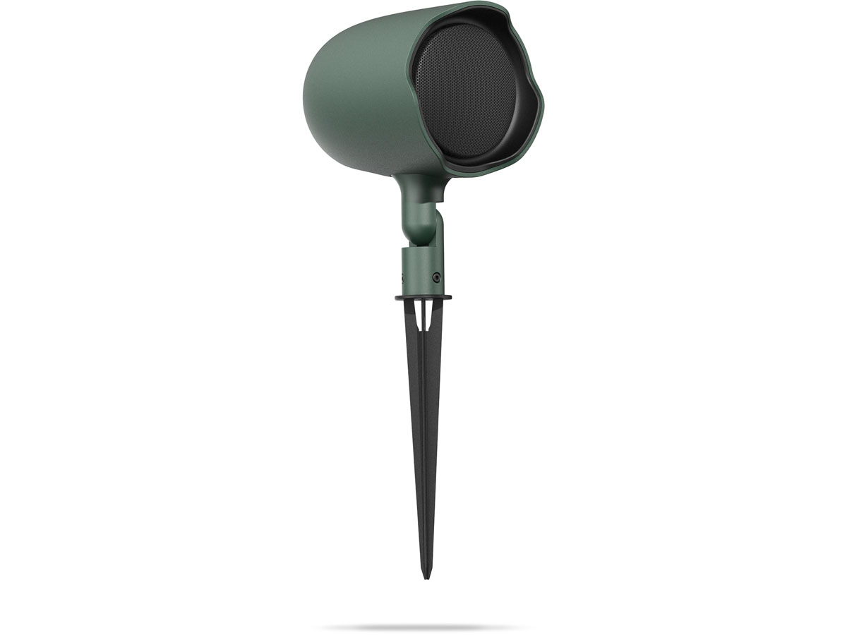 Versatile mounting options include an included ground stake for in-ground installation and an L-bracket for secure mounting on either horizontal or vertical surfaces. A low-profile, unobtrusive speaker, the GSF3 blends right into its surroundings, and is aimable for precise coverage via an adjustable hinge. Available in hunter green and tan finishes.