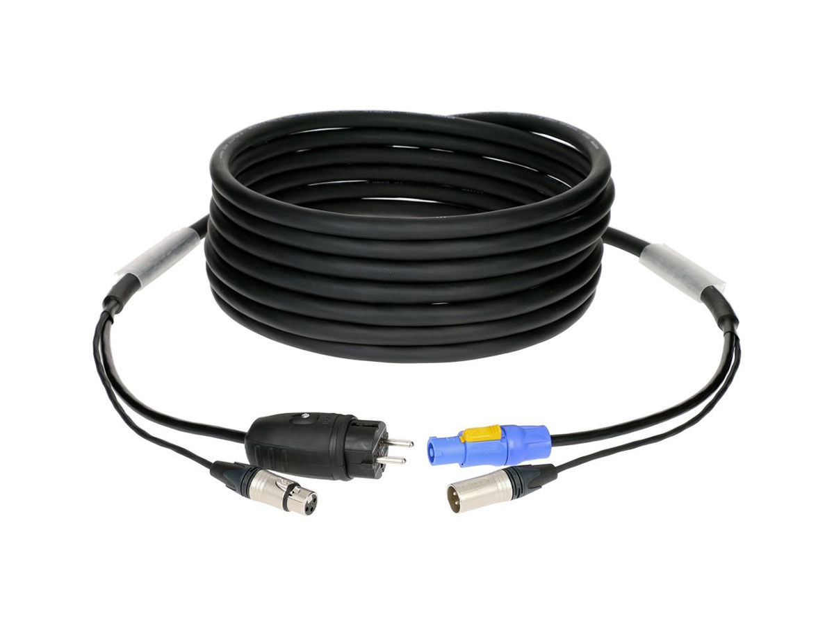 The rugged PVC outer jacket encloses the finely stranded power cable with cross-section of 3 x 2.5 mm² and the double-shielded signal conductor (foil and braided copper shields). They are available with the following connector options: XLR 3p., power CON A, powerCON TRUE1 and earthed plug