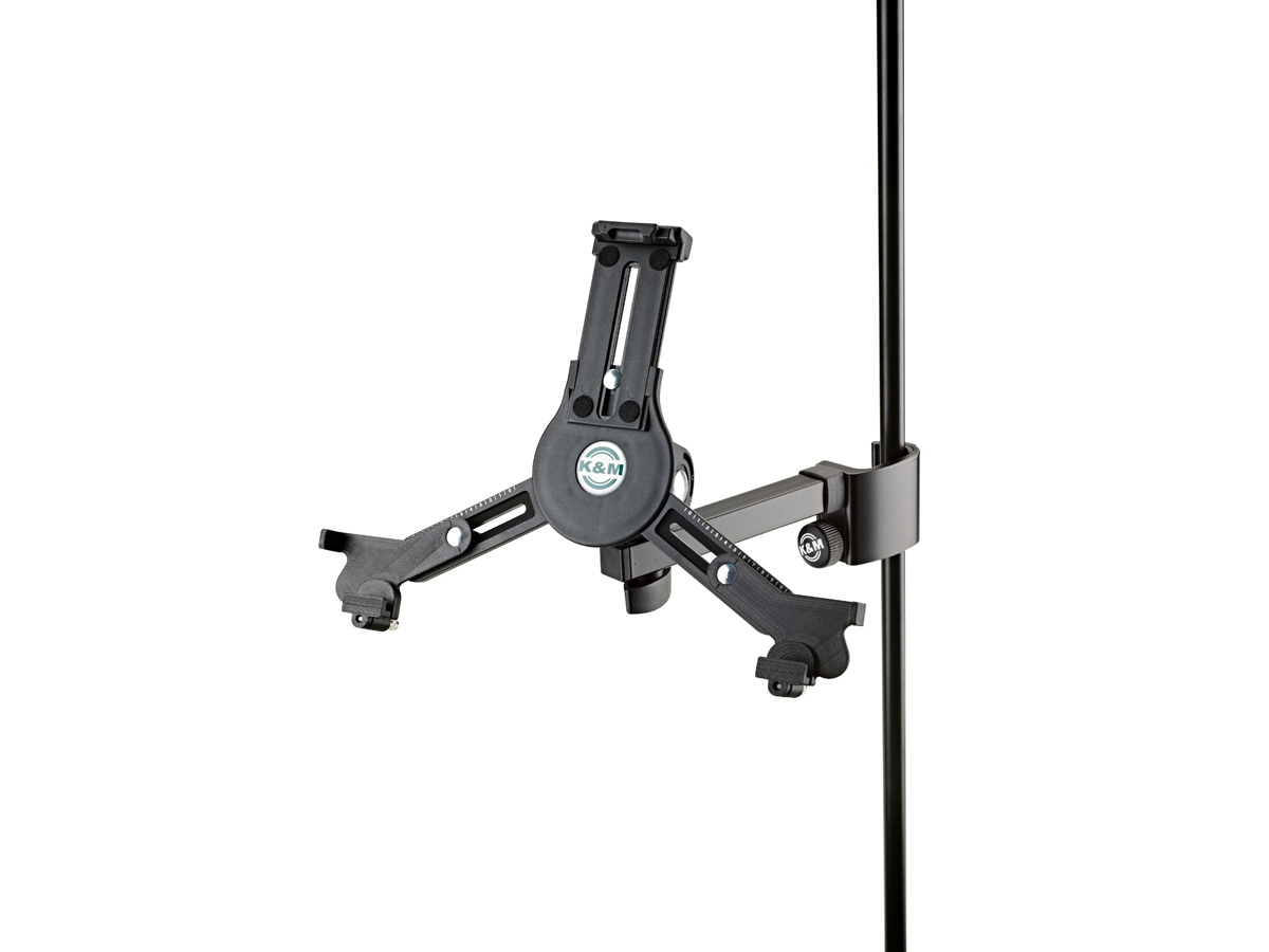 Detail 1 Detail 2 Detail 3 Detail 4 Preview: Tablet PC holder Preview: Detail 1 Preview: Detail 2 Preview: Detail 3 Preview: Detail 4 19791 Tablet PC holder 19791-016-55 - black Universal Tablet Holder for different models. The Universal Tablet Holder can be adjusted variably to accommodate different tablet sizes without needing tools and holds the devices securely and effectively for many different situations. Be it on stage, in rehearsal rooms or at home - thanks to the strong clamp element with the ergonomic clamp screw the holder can be attached to any tube up to 30 mm quickly and easily. The individually adjustable support arms can accommodate the use of tablets ranging in height from 222 to 334 mm and width from 128 to 232 mm (for example iPad, iPad Air, iPad Pro, Amazon Fire HDX 8.9, Samsung Galaxy Tab from 9.7, Google Nexus 9, Asus Transformer or Microsoft Surface as well as Surface Pro). The depth of the tablets can vary between 6 and 11 mm. For the first use of the tablet holder the support arms settings are made by adjusting the clamp screws to the size and depth of the tablet. For other uses the tablet can be attached and detached quickly and simply through a snap lock. A handy wing nut allows one to adjust the angle, so that each user will easily be able to find their ideal individual position. The tablet can switch between portrait and landscape positions. The tablet is kept in place, there is no danger of the tablet switching position by itself.