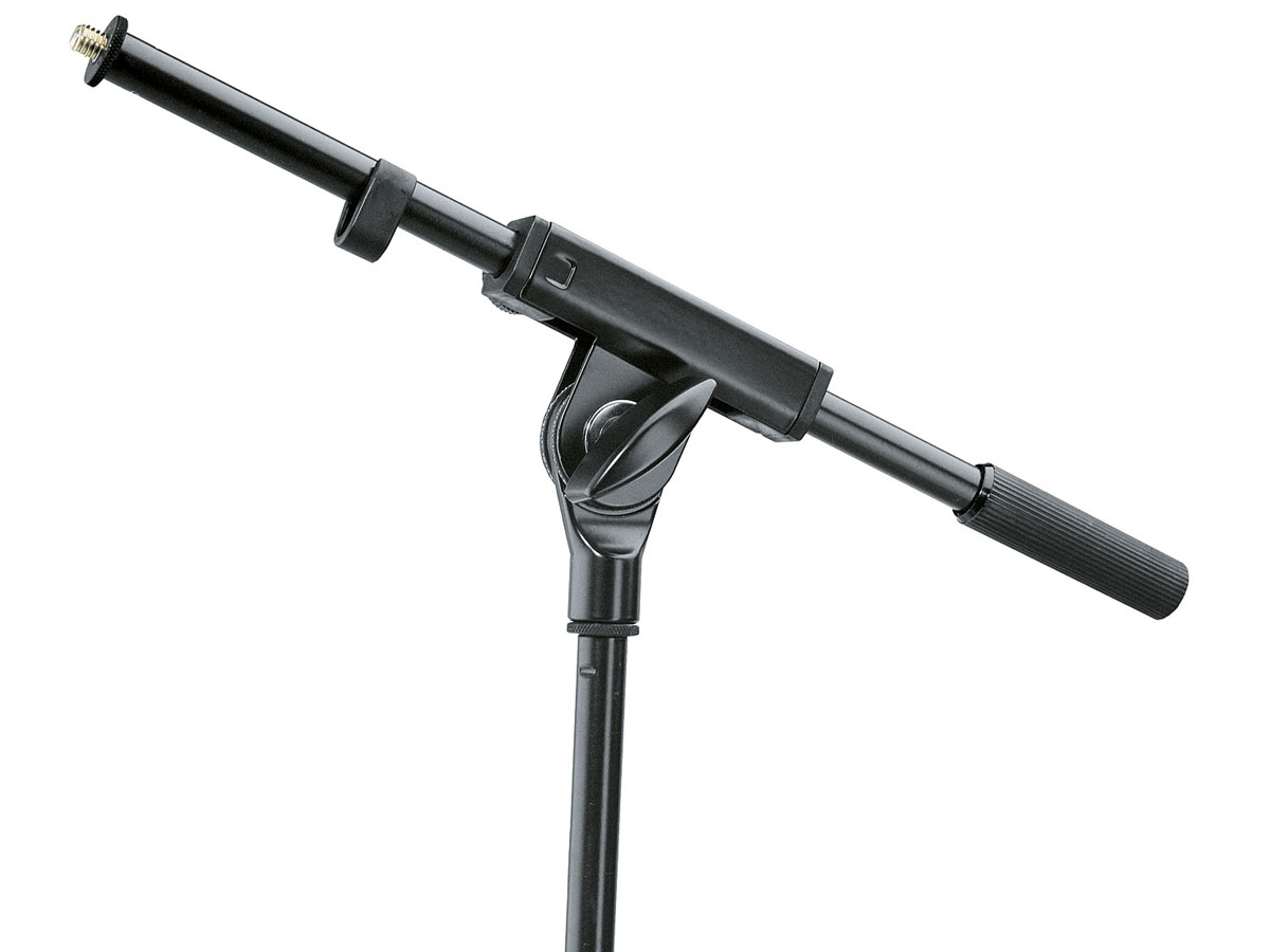Short one-piece boom arm with 3/8" thread. Locking washer and plastic grip. Smooth adjustment. Easy to tighten with wing nut.