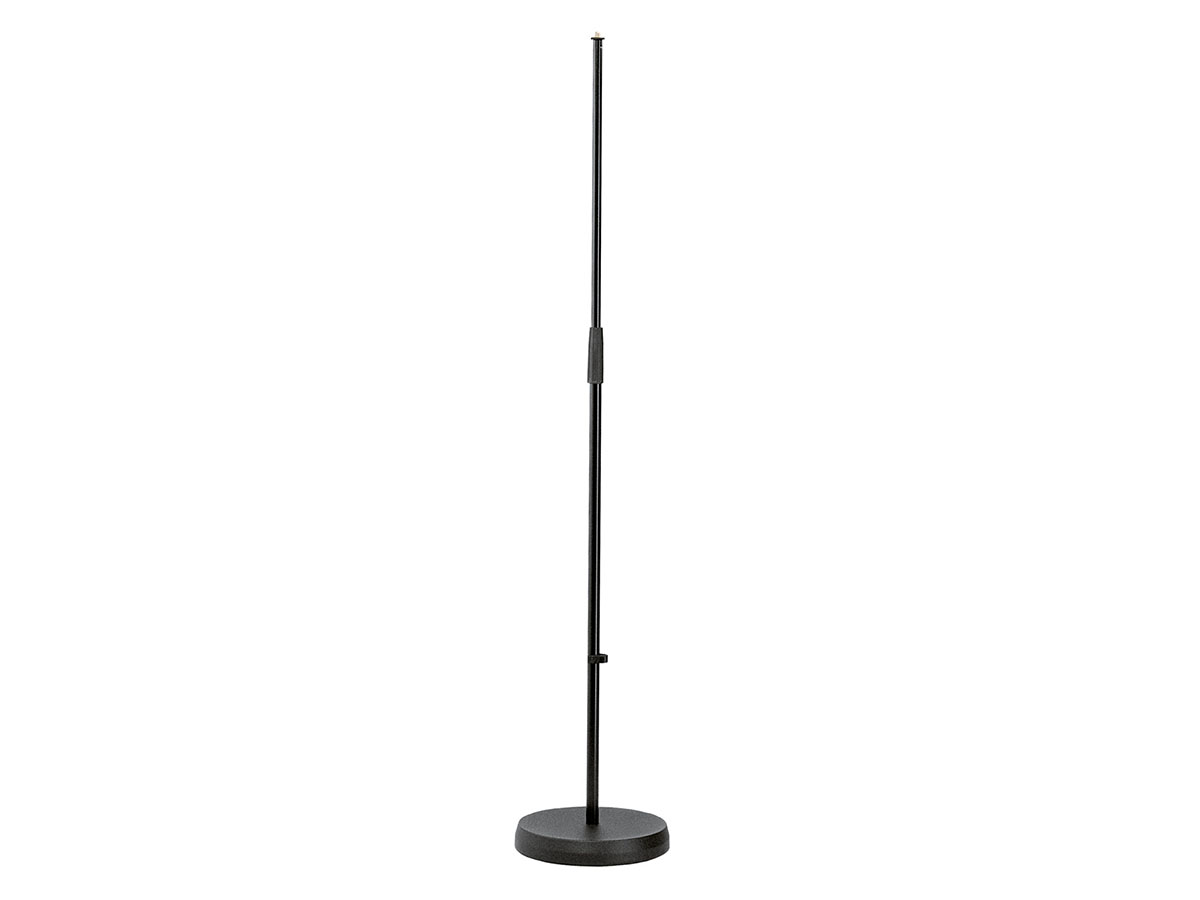 Heavy cast-iron round base, with anti-vibration rubber insert for noise filtration, plastic clutch-style height-adjustment system.