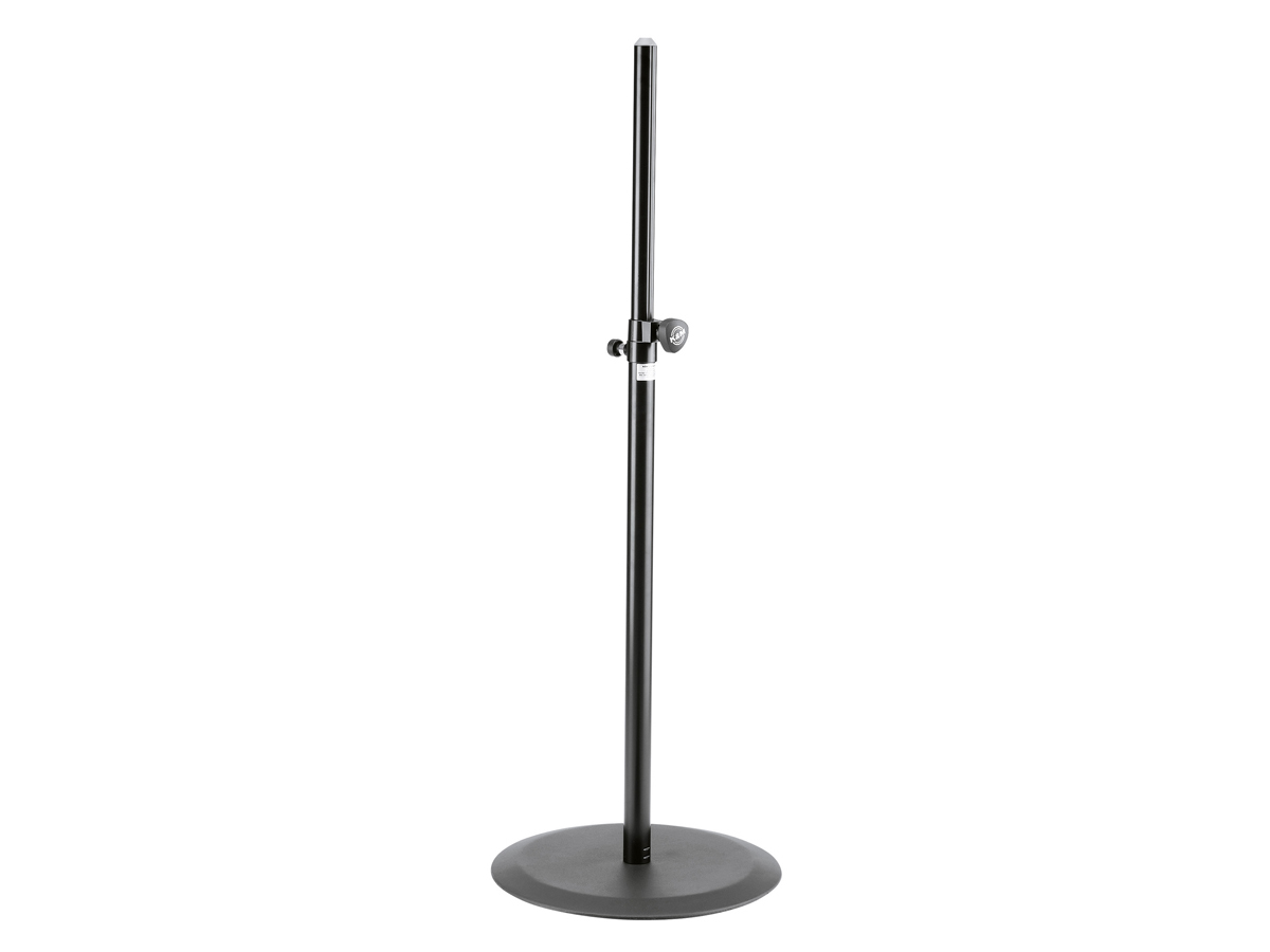 A decorative space saving speaker stand. The heavy cast iron plate with a relatively small diameter requires little space. The tried-and-tested spring-loaded bolt with locking screw makes height adjustment easy and safe. The stand has a maximum pull-out height of 1800 mm and is suitable for speakers with a maximum weight of 30 kg. The integrated mounting aid simplifies mounting the loud speaker cabinets.