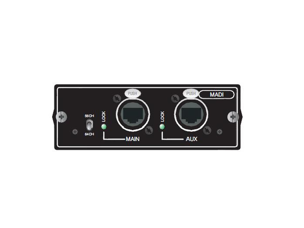The MADI I/O card can establish a 64-channel MADI input and output to a remote device such as stage rack, another console or Broadcast feed to an OB. Optical inputs and outputs are provided on SC connectors and are available in single and multi-mode versions. The auxiliary interface can be used as a redundant link. A Cat5 version of the card is also available.
