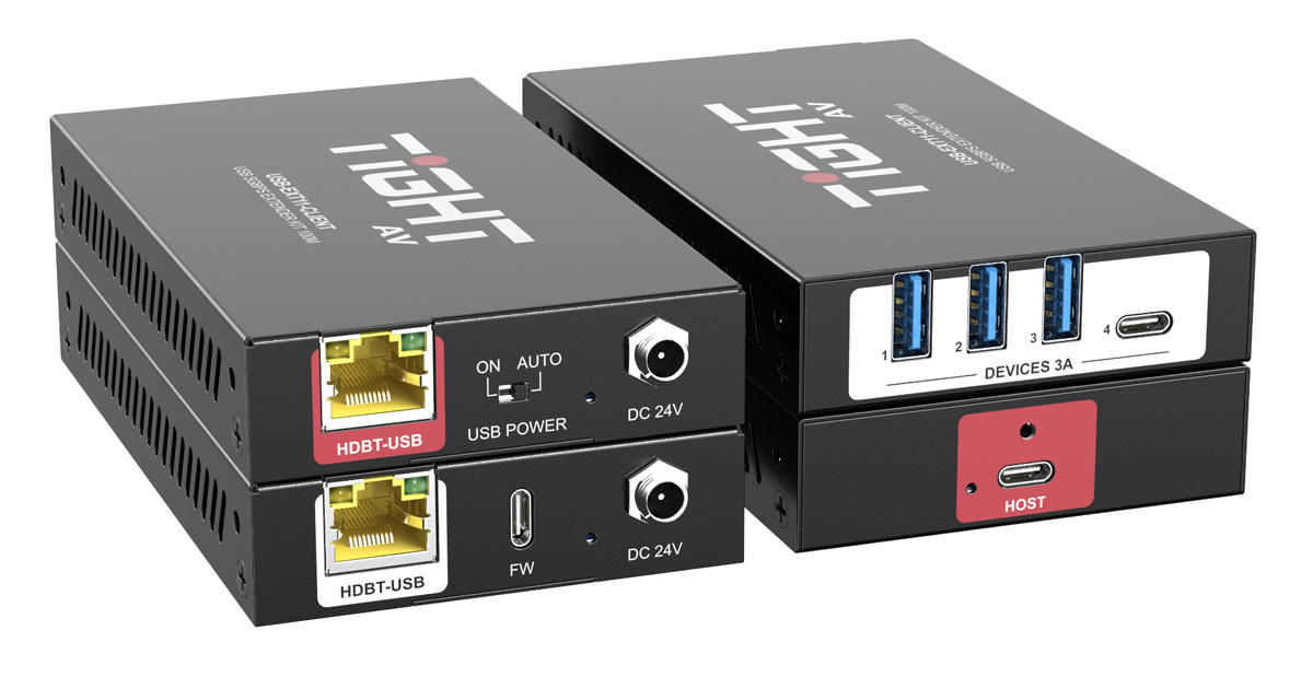 Extend your USB up to 100m with this USB 5G (USB 3.2 Gen2x1) Extender Kit over HDBTOn the HOST side you have your standard USB-C connector (with locking feature when using TiGHT AV USB-C cables) along with a FW updater port, a HDBT network connector and a power supply socket. Because of the PoC function you can decide on which end to power the kit via the power adapter.On the CLIENT side you have your 4 periferal USB ports. 3 USB-A ports and 1 USB-C port. In addition to the network connection and power supply socket you also have a switcher for the USB power in the kit.- If you set the switch to "On" the power for the USB ports will alwas stay on that can come in handy when changning hosts but you don´t want the USB units to go into sleep.